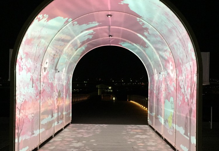 春らしさを全面に押し出し、壁面に幾層にも重なった立体的な桜並木を投影。映像に触れると桜の花びらが舞い上がる桜吹雪の演出が見られるほか、カラフルな蝶たちが一斉に飛び立つなど約10種類の仕掛けが施されており、見るものを一足早い春へと誘う。