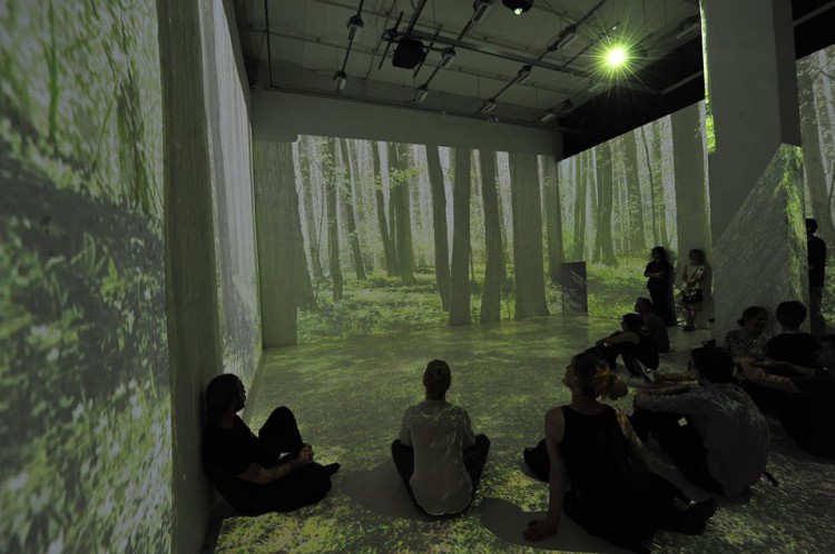 四方囲まれたスペースの壁面及び床面を利用して、映像に囲まれている空間を制作しました。