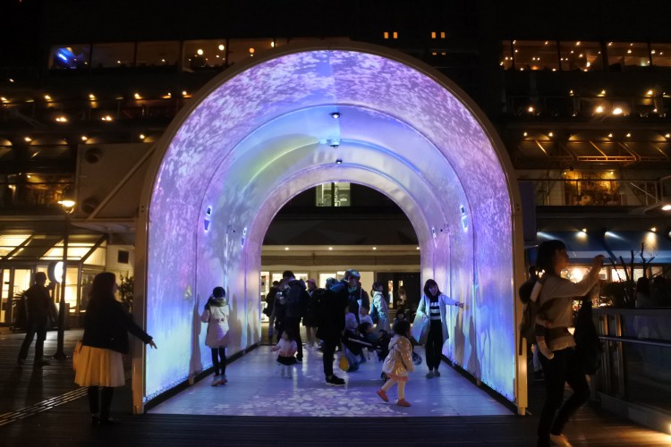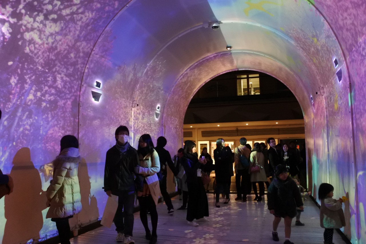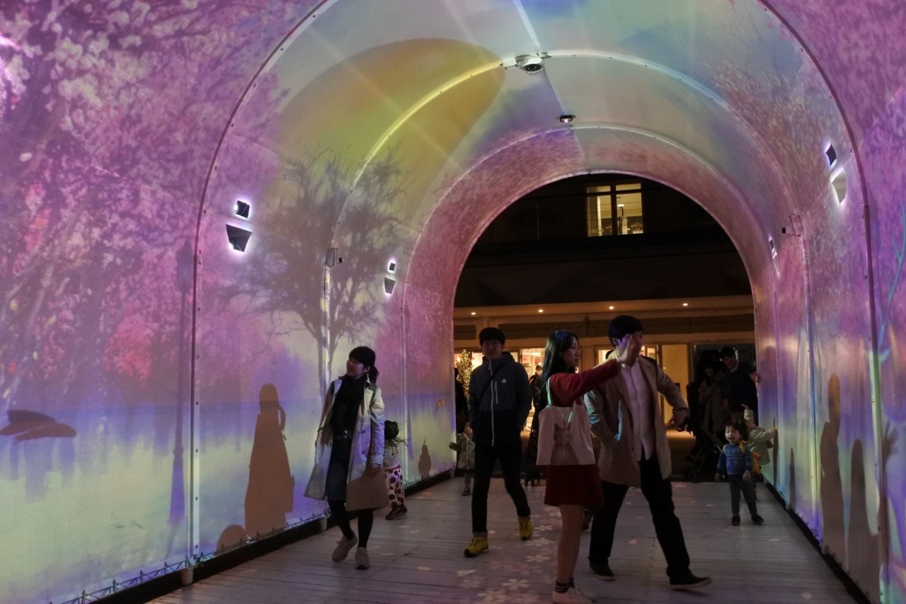 桜並木を背景に月光や富士山が出現するメインの仕掛けのほか、自らのタッチで、夜空に満開の桜が開花したり、鮮やかな蝶が舞ったりするアクションや、風の効果音とともに桜の花びらが豪快に舞う仕掛けなど、片面に4つ両面の合計で8つの仕掛けが楽しめます。全ての仕掛けが発動すると「花鳥風月」のビジュアルが完成する仕組みになっています。それぞれも美しいギミックですが、全てが発動したドーム内を見渡すと、一つのストーリーが展開されています。