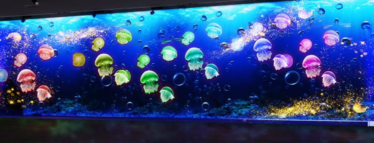 コミュニケーションウォールエリアでは、「ワルツ」をテーマにクラゲにタッチするとインタラクティブにカラーが変化する演出もとりいれております。仙台うみの杜水族館 クラゲのいやしエリアにて 常設展示