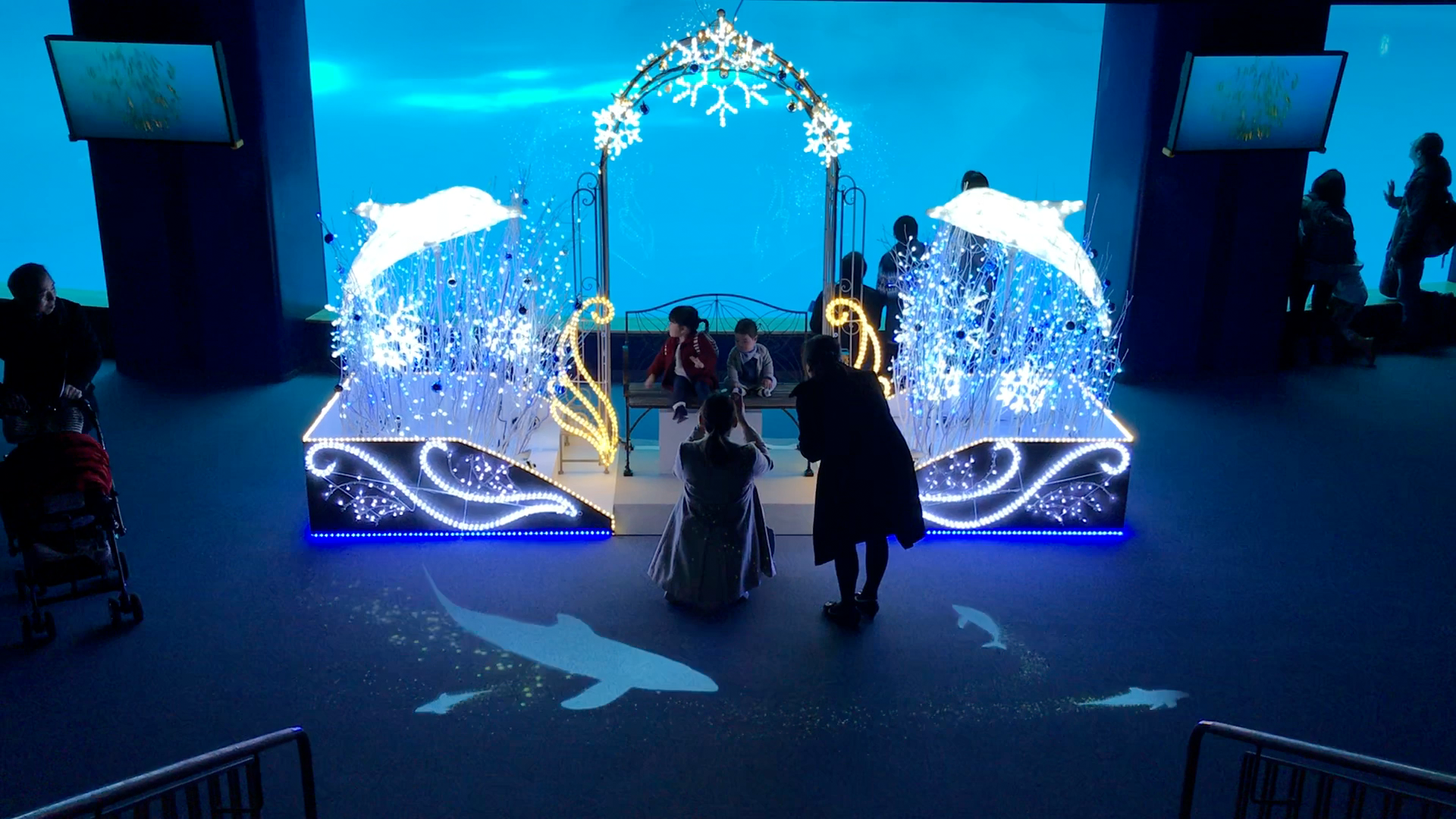 イルミネーションが輝くフォトスポットに人が立ち寄ると、足元のイルカ達が泳ぎ出します。